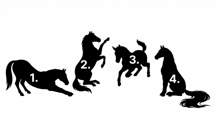 Tentokrát se podívejte na čtyři siluety koní. Každý z nich stojí v jiné pozici a působí jiným dojmem – jeden klidně odpočívá, jiný se vzpíná, další je v pohybu a poslední působí elegantně a vyrovnaně.