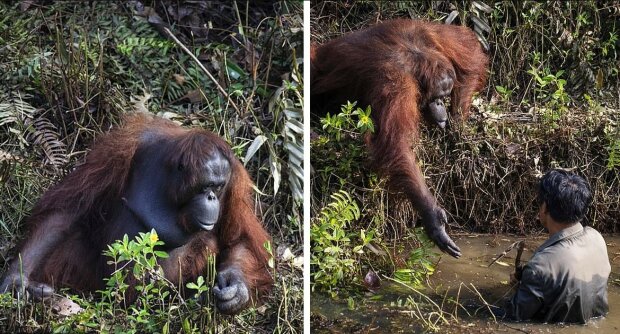 V tomto okamžiku přistoupil orangutan a podal mu ruku, což vypadalo, jako by se ptal, zda mu může pomoci.