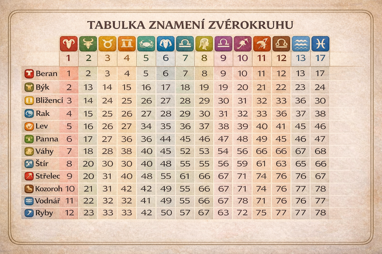 Najděte své znamení v levém sloupci a znamení partnera v horním řádku. Číslo v průsečíku těchto dvou znamení pak odkazuje na typ vztahové energie, která mezi vámi přirozeně vzniká.